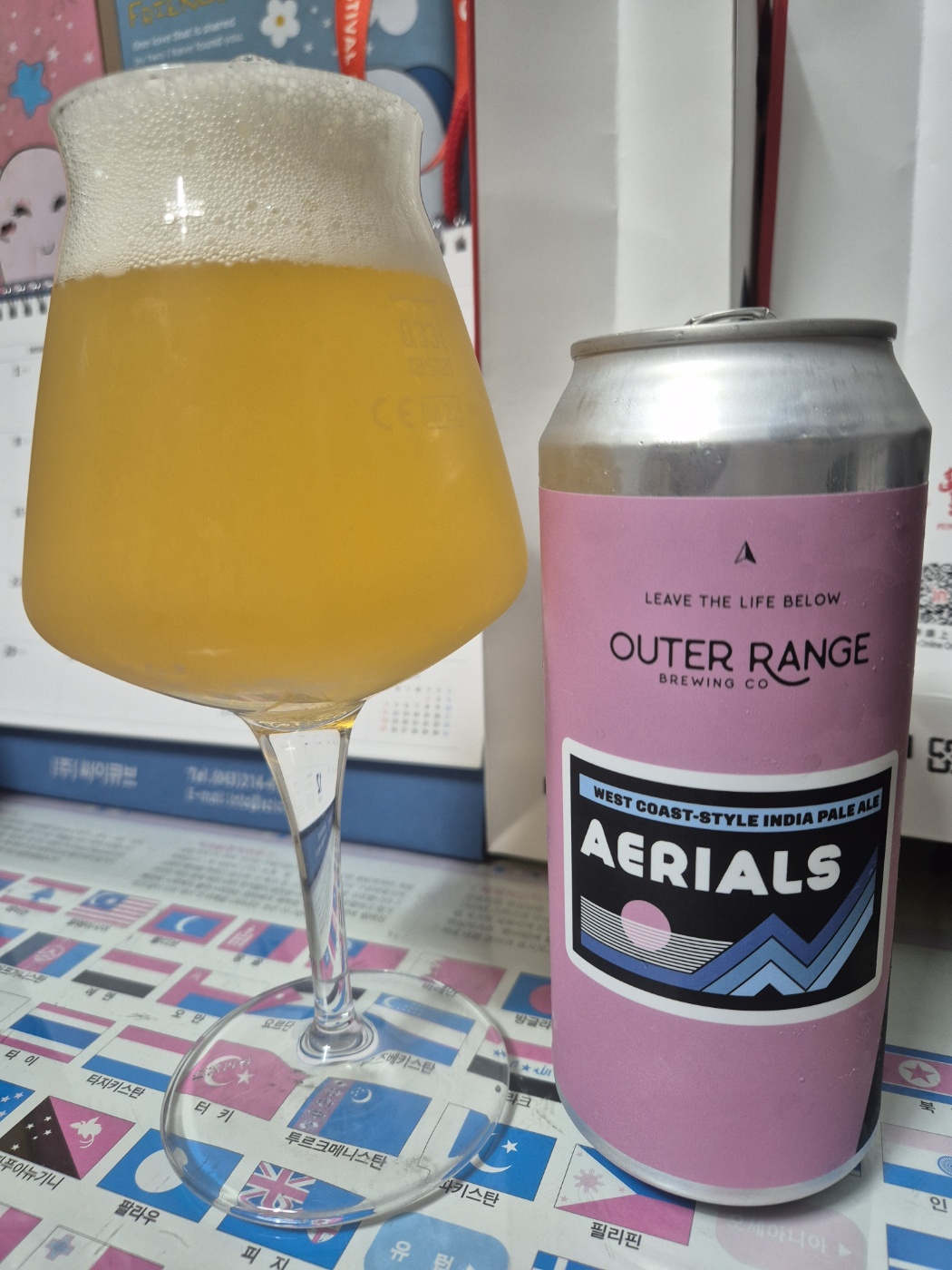 이번에 마셔본 맥주는 아우터 레인지 브루어리에서 만들어진 에어리얼 웨스트 코스트 스타일 IPA입니다최근에 미국 IPA를 잔뜩 마시긴 했지만 물욕과 호기심을 이기지 못하고 GS25 어플에서 구매했습니다이 또한 아우터 레인지 브루어리의 IPA 세트 중 하나입니다이름에서 알 수 있다시피 비교적 깔끔한 서부식 IPA를 표방하고 있습니다사용된 홉 품종은 모자익 크라이오와 캐스케이드이며 알코올 함량은 6.5%입니다 잔에 따라보니 형광빛이 도는 듯한 반투명하고 진한 파인애플 주스 같은 색입니다거품은 약간 거칠지만 끈적하고 높게 쌓입니다다만 유지력이 그렇게 강하진 않았습니다 코에서는 달콤상큼한 백도, 설익은 망고, 은은한 파인애플이 주력으로 나타났습니다IPA 특유의 파릇파릇한 풀이나 송진은 매우 절제되어 있었습니다향..